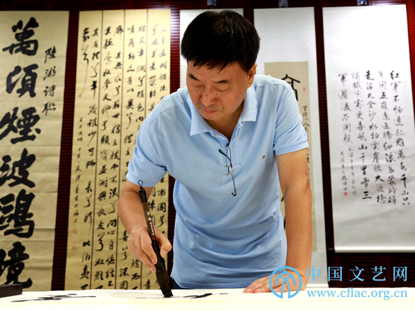 9月8日,“石油精神翰墨行——中国书法家志愿服务走进西气东输”活动在上海举行。图为中国书协副秘书长吴占良现场创作书法作品。中国文艺网 韩雪竹摄