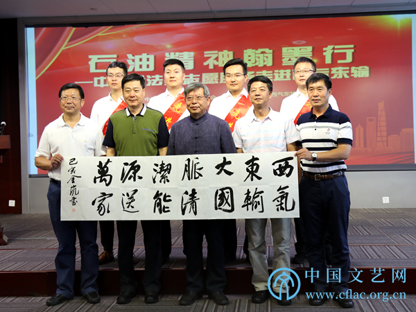 9月8日,“石油精神翰墨行——中国书法家志愿服务走进西气东输”活动在上海举行。图为中国书协理事、中国书协行业建设委员会副主任兼秘书长、中国石油书协主席于恩东现场创作书法作品并与西气东输管道公司职工合影。中国文艺网 韩雪竹摄