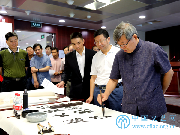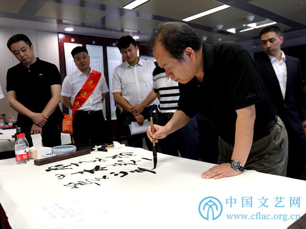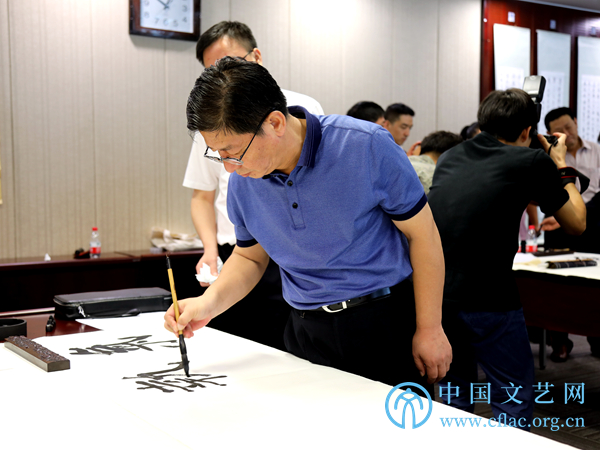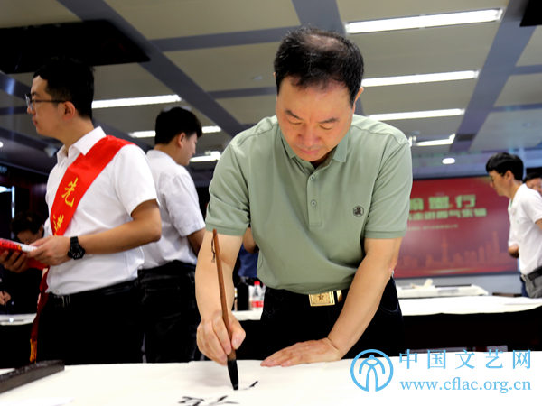 9月8日,“石油精神翰墨行——中国书法家志愿服务走进西气东输”活动在上海举行。图为中国书协理事、中国书协行业建设委员会副主任兼秘书长、中国石油书协主席于恩东现场创作书法作品。中国文艺网 韩雪竹摄