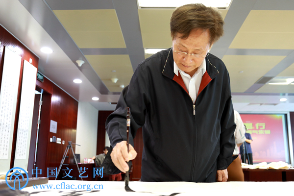 9月8日,“石油精神翰墨行——中国书法家志愿服务走进西气东输”活动在上海举行。图为原老干部(职工)管理局局长、中国石油书协名誉主席樊胜利现场创作书法作品。中国文艺网 韩雪竹摄